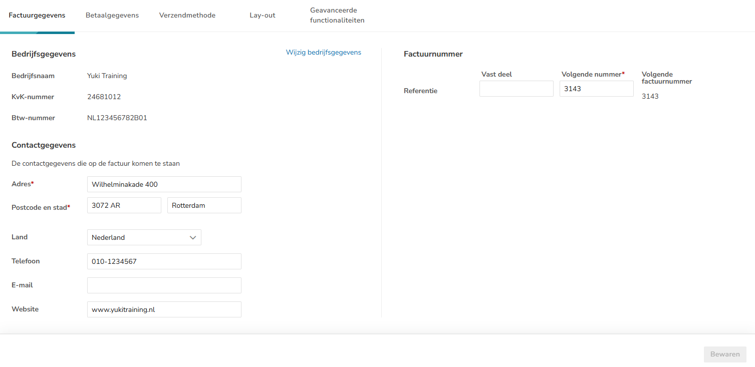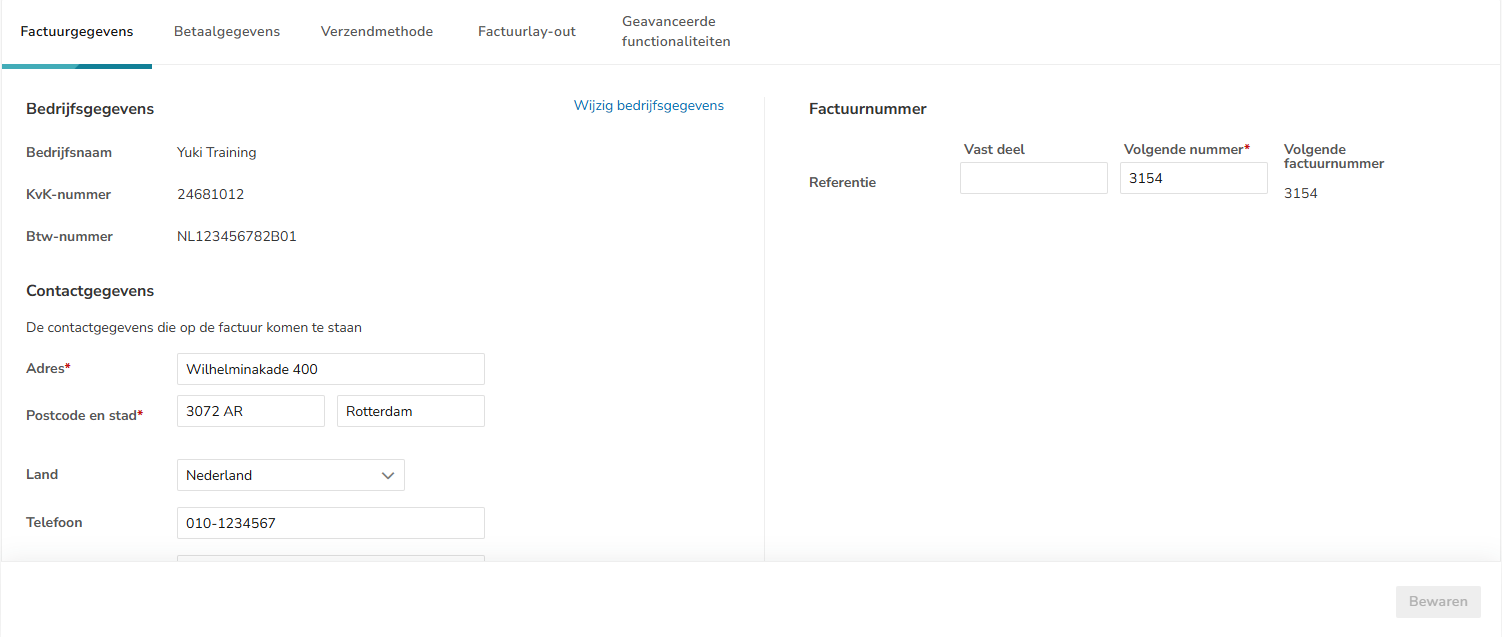 Voorkom dubbele factuurnummers. Dus heb je al facturen verstuurd voordat je met Yuki werkte, laat dit nummer dan volgen op het laatst gebruikte nummer.