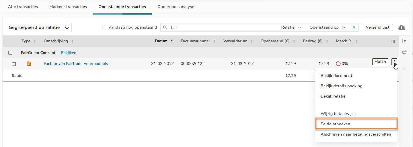 - selecteer je de menuoptie Saldo afboeken in het dropdownmenu.