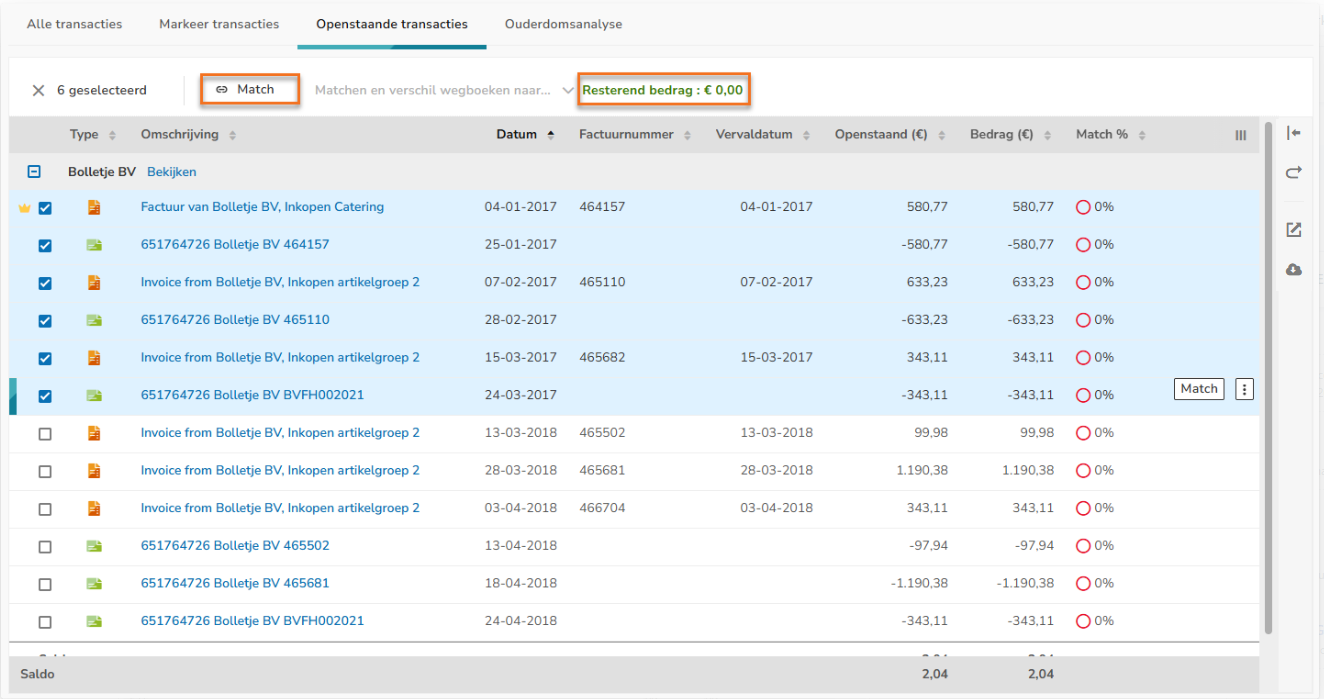 Om de verschillende openstaande posten van een relatie in één keer te matchen: