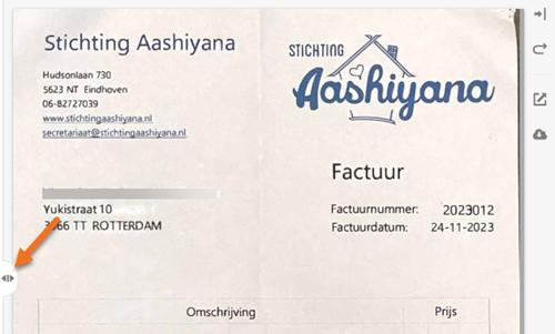 Klik op de regel van de desbetreffende factuur en vervolgens op de knop Tonen /Verbergen (icoontje met pijltje naar rechts / links) om het documentvoorbeeld in het scherm te laten tonen of te verbergen.