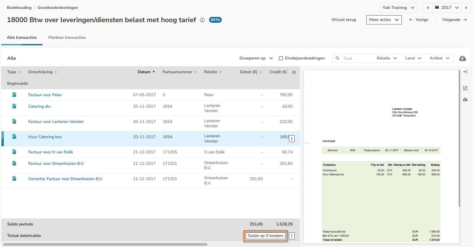 Klik bovenin het scherm op Openstaande transacties. Selecteer vervolgens rechts in het scherm achter Openstaand op de datum 31-12-2017. Het volgende scherm wordt geopend: