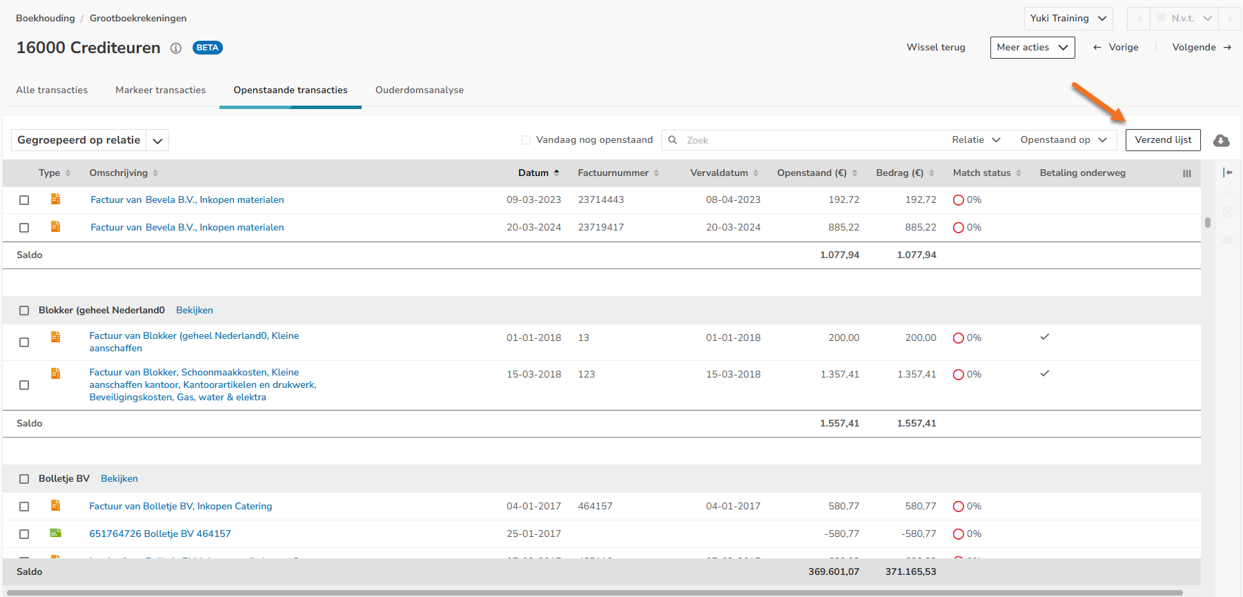 Nadat de debiteuren en crediteuren zoveel mogelijk zijn opgeschoond kan je hier door middel van de knop Verzend lijst een vraag naar de klant sturen.