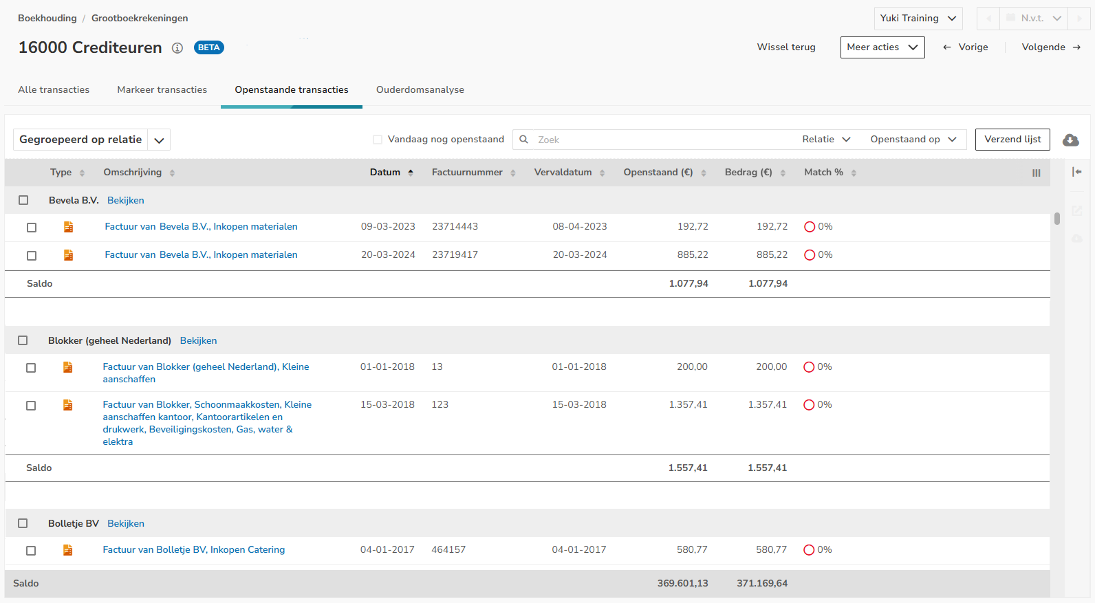 In het overzicht 'Openstaande transacties' kun je alle openstaande posten bekijken van debiteuren, crediteuren of RC personeel. Deze openstaande posten zijn in Yuki: