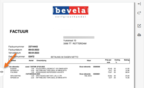 Klik op de regel van de desbetreffende factuur en vervolgens op de knop Tonen /Verbergen (icoontje met pijltje naar rechts / links) om het documentvoorbeeld in het scherm te laten tonen of te verbergen.