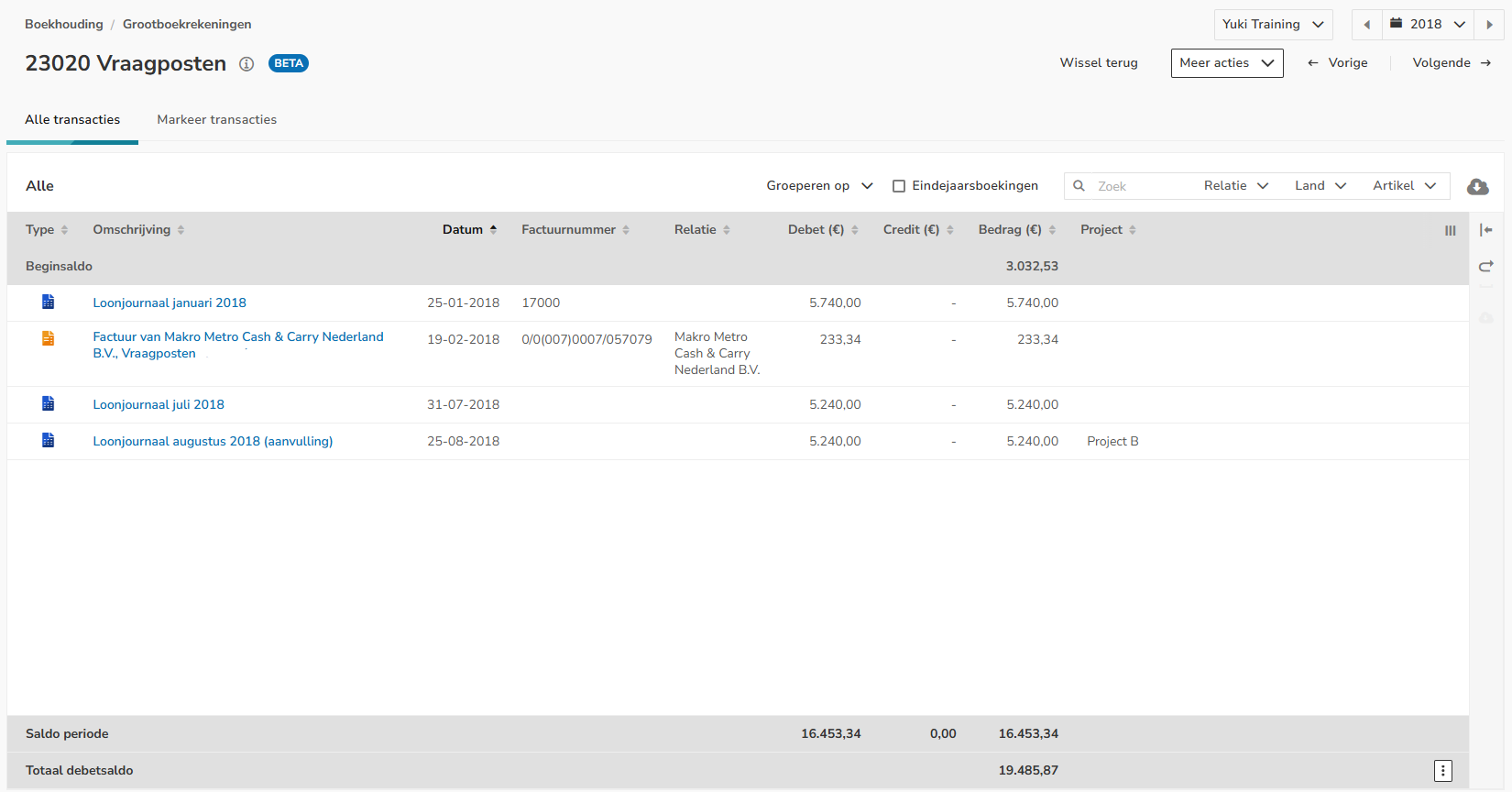 In het overzicht kun je alle posten bekijken die tijdelijk zijn geboekt op grootboekrekening '23020 Vraagposten'. Deze vraagposten zijn in Yuki: