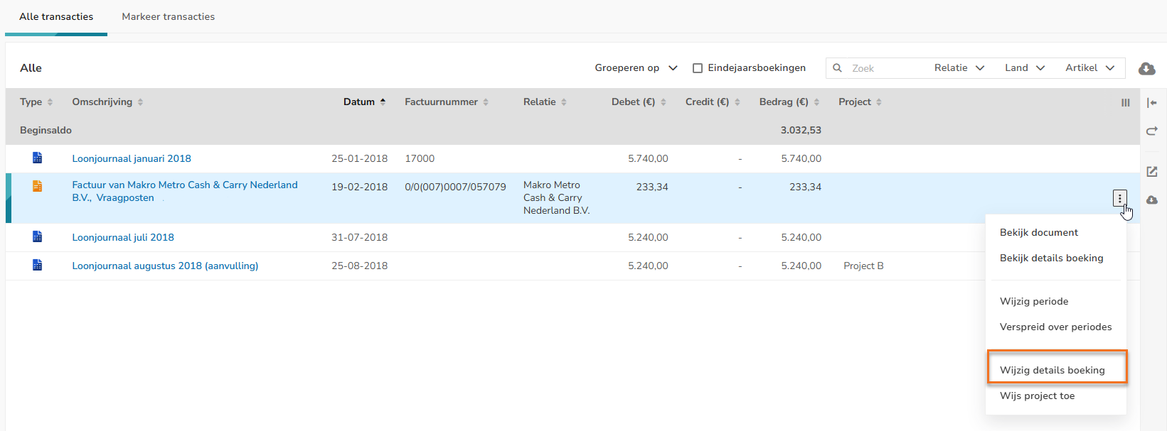- selecteer je bij een factuur de menuoptie Wijzig details boeking in het dropdownmenu.