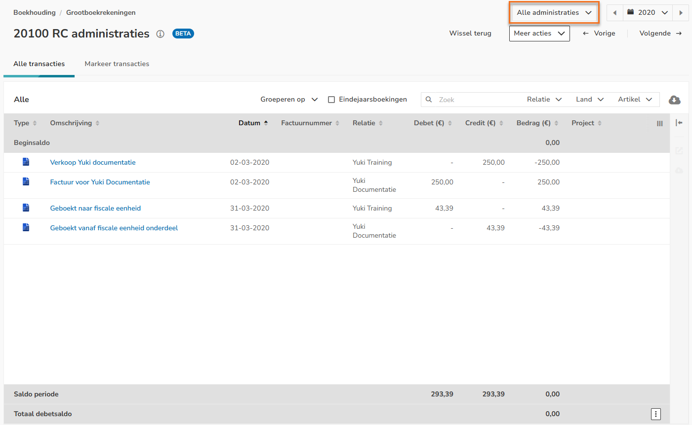 Het overzicht van de grootboekrekening '20100 RC administraties' moet per saldo op nul uitkomen als je in het dropdownmenu Alle administraties selecteert.