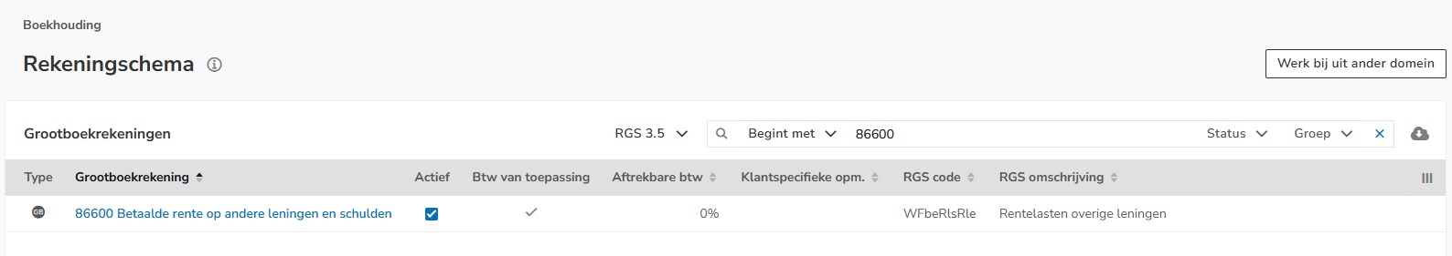 Via de dynamische grootboekrekening '86600 Betaalde rente op andere leningen en schulden' kan een extra grootboekrekening worden aangemaakt om de te betalen rente te boeken.
