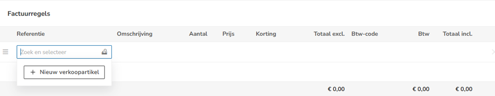Klik op de optie + Nieuw verkoopartikel om een nieuw verkoopartikel toe te voegen.