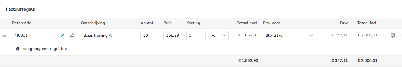 - Bewerken: klik op een veld in de factuurregel en wijzig de gegevens.