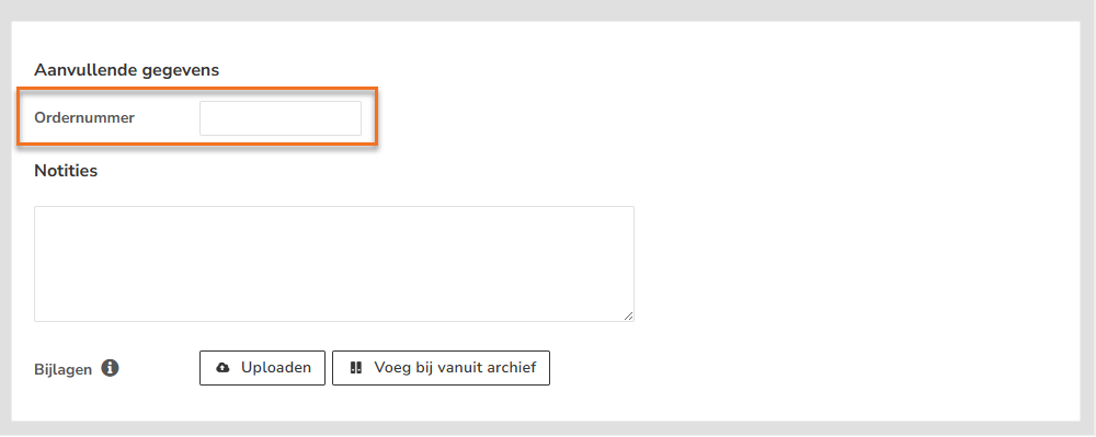 Om de verkoopfactuur te kunnen versturen via Peppol moet het veld 'Ordernummer' verplicht zijn ingevuld. Je vindt dit veld onder de 'Aanvullende gegevens'.