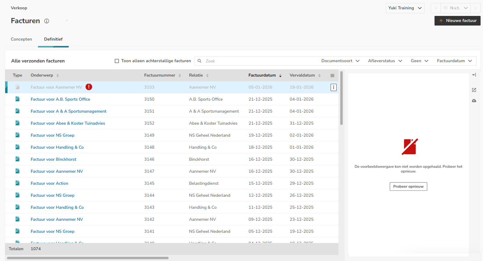 De factuur verdwijnt uit het overzicht 'Conceptfacturen' en wordt verplaatst naar het overzicht 'Definitieve facturen'.