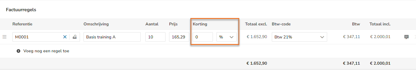 Het is in Verkoop Standaard mogelijk om een kortingspercentage of een kortingsbedrag te berekenen per factuurregel (artikel) op een verkoopfactuur.