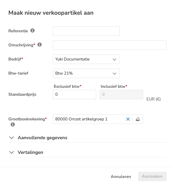 Voor een uitgebreide beschrijving van de in te voeren velden zie artikel Verkoop Standaard - Verkoopartikel aanmaken.
