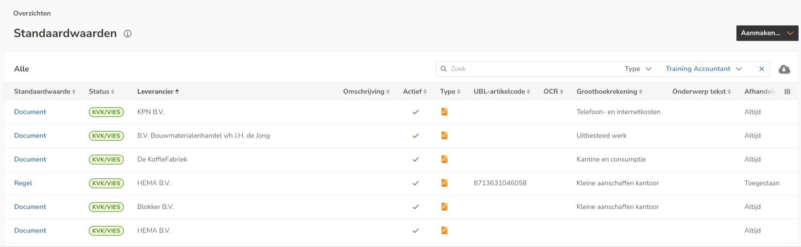 In dit scherm zie je alle standaardwaarden en UBL-regels die op dit moment voor leveranciers in het portaal zijn aangemaakt.