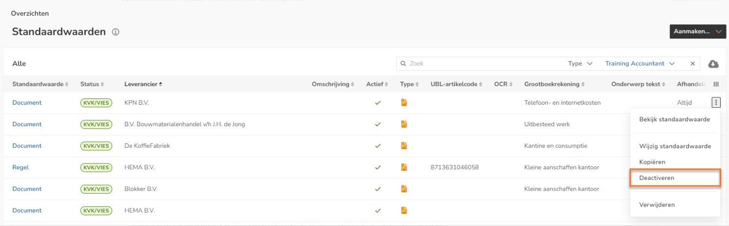 OF - beweeg je met je muis boven de regel van de desbetreffende leverancier, klik je op de knop met de drie puntjes en selecteer je vervolgens Activeren of Deactiveren in het dropdownmenu.